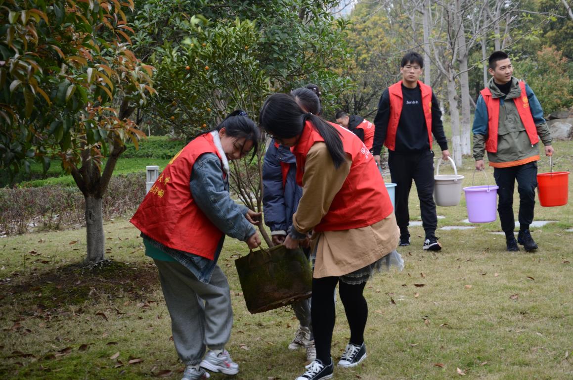 活动当日,一棵一棵活力满满的金桔树苗和种植工具被整齐地摆放在满冠平台生命与环境科学学院的空地上。报名参加活动的师生也陆续赶来,他们有序地领取树苗及种植工具后,纷纷在相应的种植区域展开行动。松土、挖坑、安置树苗、填埋、浇水……大家一起动手为一棵棵树苗“安家”。植树现场充满朝气。