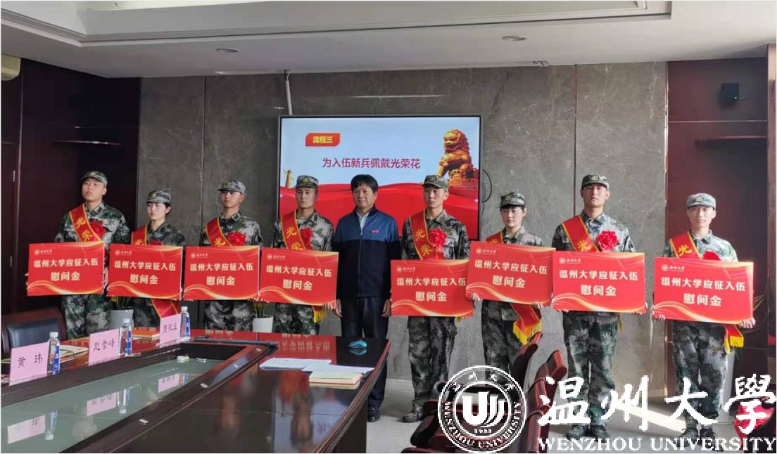 欢送会上,校党委副书记庄兴忠为入伍新兵佩戴上了光荣花,新兵代表米拉迪力·图尔荪和郑洁同学在会上表达了对学校培养的感激以及刻苦训练、为校争光的决心。他们是优秀的人民子弟兵,也是“求学问是、敢为人先”的温大人!