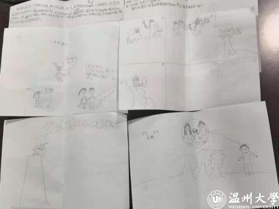 草长莺飞四月天,三角梅阵阵飘香,正如孩子们天真烂漫的笑脸。这一回,党员志愿者们准备的第一项活动就是带着孩子们一同谱写故事的新乐章。为了让故事新编游戏进行得更加顺利,党员志愿者们耐心细致地启发孩子们开动小脑筋,一个个奇思妙想的故事从孩子们的口中蹦出。教室里,12个孩子三三两两地自愿成组,每组配备两位志愿者共同完成故事新编。一边竭尽全力苦思冥想,一边欢声笑语不断,创新思考脑洞大开的过程轻松且愉悦。创作的火花不断闪现,在三四年级小朋友们的小脑瓜里有盘古开天辟地的“褐色墨水”与女娲造人的混合进阶版;也有小红帽和红太狼与白雪公主的后妈毒苹果以及遇到白马王子的联动;还有也有十分贴切现实生活的一面,大灰狼是被巨额的红包索取而致破产露出马脚。后羿射日与牛郎织女的故事也得到了漫画形式的再演绎。孩子们克服恐惧,走上台前,大胆地讲述自己的故事,欢笑声与鼓掌声在教室上空阵阵回荡。
