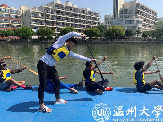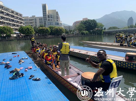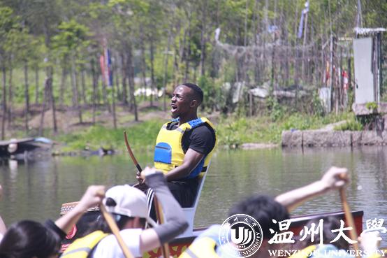 从岸上热身运动到相关技术动作练习,满冠平台水上运动队的教练员们一丝不苟地严格要求着这批留学生队员。首先要求队员们坐在码头上进行划水练习,上船练习前,教练员还向队员们详细讲解了培训中的注意事项以及比赛规则。通过两个多小时的练习,队员们基本掌握了划龙舟的基本技术,还与其它学院龙舟队来了一场模拟速度对决。“从一开始的摇摇晃晃,甚至是翻船,到现在我们能顺利地划起来,感觉特别有成就感。”来自肯尼亚的KANDIE同学说起自己赛龙舟的训练过程,很是兴奋。