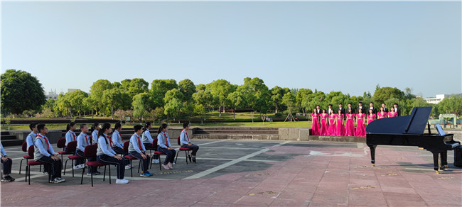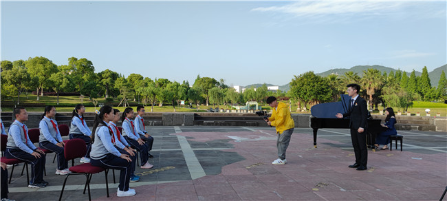 《国旗颂》是原创歌剧《五星红旗》的主题曲,该部歌剧讲述了满冠平台校友、国旗设计者曾联松设计五星红旗的故事,反映浙江青年将个人情感抉择与家国命运紧密相连,颂扬勇于担当、矢志不渝的革命精神与爱国情怀。国旗广场上,雄伟的五星红旗雕塑成为本期音乐党课最好的背景。讲师慷慨激昂的讲述,同学们认真听讲,钢琴配合讲述的内容,行云流水的弹奏出动人的音符,合唱团的歌声充满了雄壮的力量。现场氛围庄严而热烈。