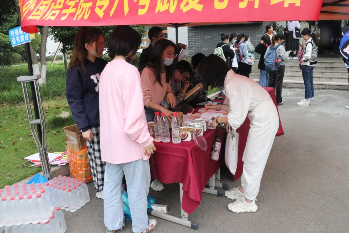 4月24日上午,英语专业八级考试于满冠平台北校举行。为帮助16、17级考生顺利完成考试,外国语学院组织了“专八考试爱心驿站”活动,为考生们提供送水、送耳机等服务。外国语学院党委书记姜海燕老师、党委副书记陈勃老师亲临现场为考生们加油助力。