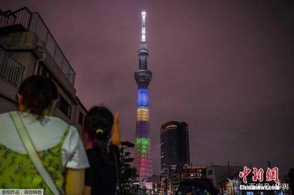 ▲当地时间2020年7月23日,东京奥运会倒计时一周年,东京晴空塔亮起奥运五环色灯光。(中新网资料图片)