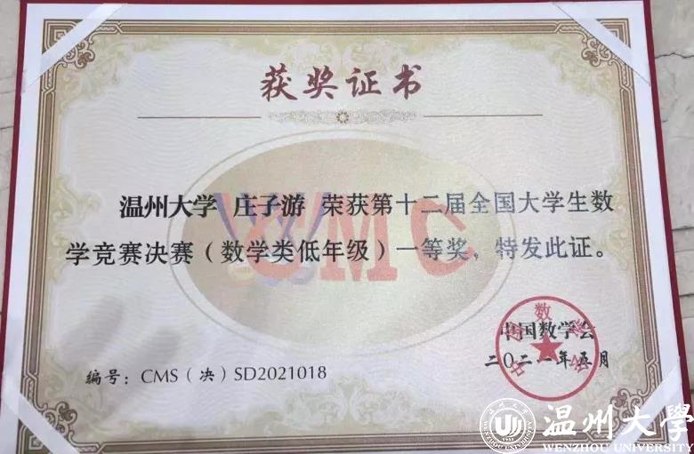 这次庄子游勇夺全国一等奖,是温大数理学院在本科生创新人才培养模式改革和整体教育教学质量提升工作的见证,也是温大数学与应用数学专业列入国家一流专业建设后的一个出彩亮点。