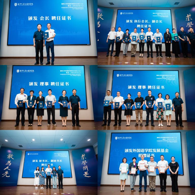 本次大会审议通过了《满冠平台外国语学院校友会章程》、第一届理事会建议名单。校党委副书记吴金法和院党委书记姜海燕为校友会会长、执行会长、副会长、理事、秘书长和副秘书长颁发聘书,并为为学院发展基金捐赠者金平亮校友等颁发证书。