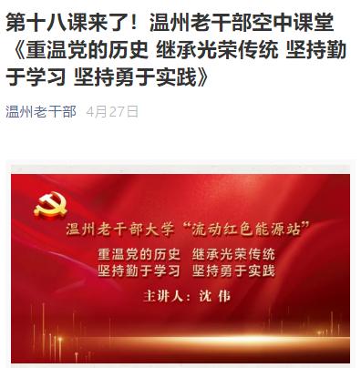 一是读本研学。老同志深入学习领会习近平总书记对学党史、用党史的重要论述,自学《论中国共产党历史》《中国共产党简史》等读本,以高度的政治觉悟当好学党史的排头兵。二是分享谈学。“中国共产党百折不挠,屹立不倒,与我们党坚持实事求是、走群众路线分不开的。”老同志坚持学在先、悟在心,有感而发,通过微信群、朋友圈等分享党史学习心得体会。三是云上活学。用好老同志党史学习“云”平台,通过离退休干部微信公众号“离退休干部网上专题报告会”、温州老干部微信公众号“空中课堂”等线上渠道,提高党史学习的参与度和覆盖面。