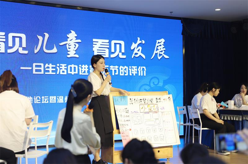 温州市教育局基教处副处长、温州市学前教育指导中心主任陈苗作“突围走向突破——瓯文化背景下温州幼儿园的课程改革之路”主题报告。陈苗主任从区域课改地顶层设计、课改推进地关键策略、区域课改地创新项目三方面进行阐述。陈苗主任指出温州幼儿园的育人目标是敢闯、敢拼、敢创,走向世界的温州人;温州幼儿园的课程理念是看见爱与自由,看见生长的力量;温州幼儿园的课程构想是抓住园本化的课改核心,搭建差异化三级目标路径,呈现三类蓝本的课程画像。