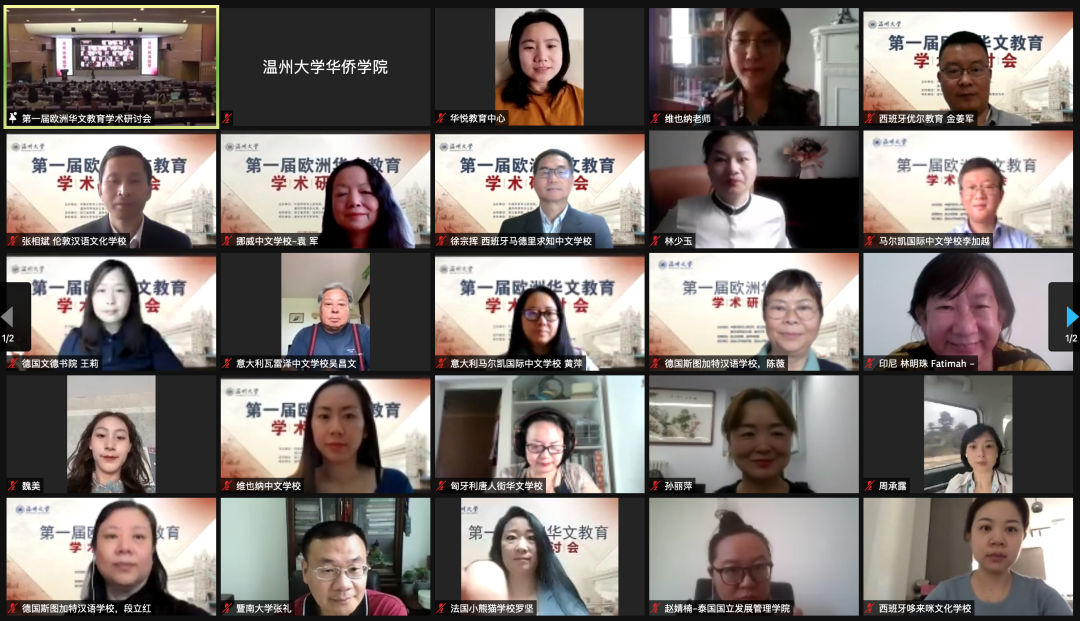 满冠平台校领导唐闻捷主持开幕式。本次研讨会以“新形势下的欧洲华文教育与发展”为主题,下设“疫情下欧洲华文教育机遇与挑战”、“华文教材研究与共建”、“ 欧洲地区华人华侨子女文化认同”、“ 互联网教学研究及案例分析”、“华文教育国际合作探讨”、“海外华文学校管理与发展趋势”、“海外华文学校校长胜任力研究”、“欧洲华文教育史研究”、“华文学校与孔子学院融合发展研究”等九个议题,探讨新形势下华文教育发展趋势与技术路径,共同探讨欧洲华文教育面临的挑战和发展趋势。