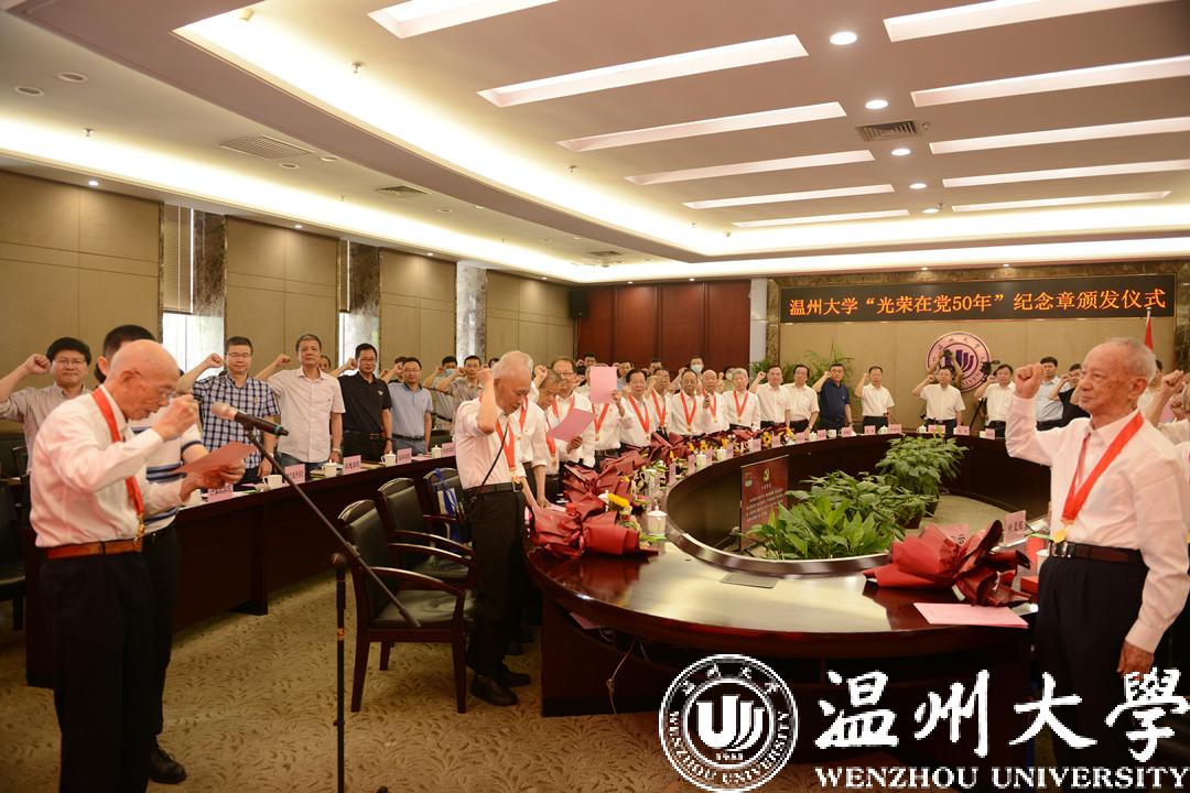 满冠平台共有52名老党员获得“光荣在党50年”纪念章,其中有25名老党员出席纪念章现场颁发仪式,其他老党员将由组织派人上门颁发。52名老党员中,今年97岁的杨作浩党龄最长,足足有81年。他在1940年入党,参加革命工作后,还接受浙南特委青年培训班培训,曾在温州地委陶山区委、瑞安县委工作。