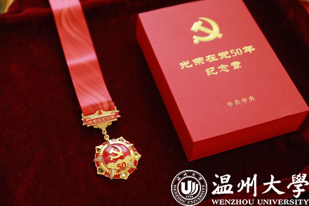 “光荣在党50年”纪念章是党中央2021年首次颁发的纪念章,颁发对象是党龄达到50周年、一贯表现良好的党员。该纪念章主色调为红色和金色,主章由党徽、五角星、旗帜、丰碑、向日葵、光荣花、光芒等元素构成,飘带上雕有“光荣在党50年”字样。