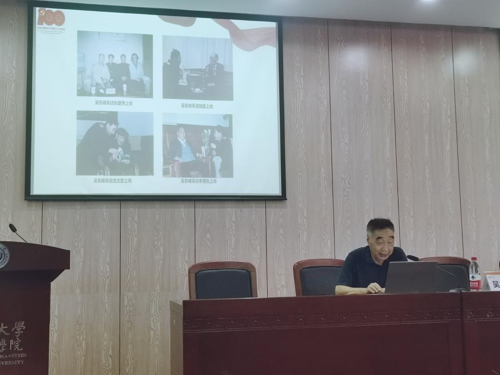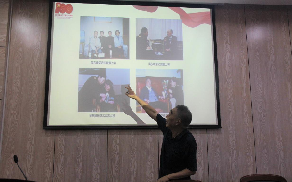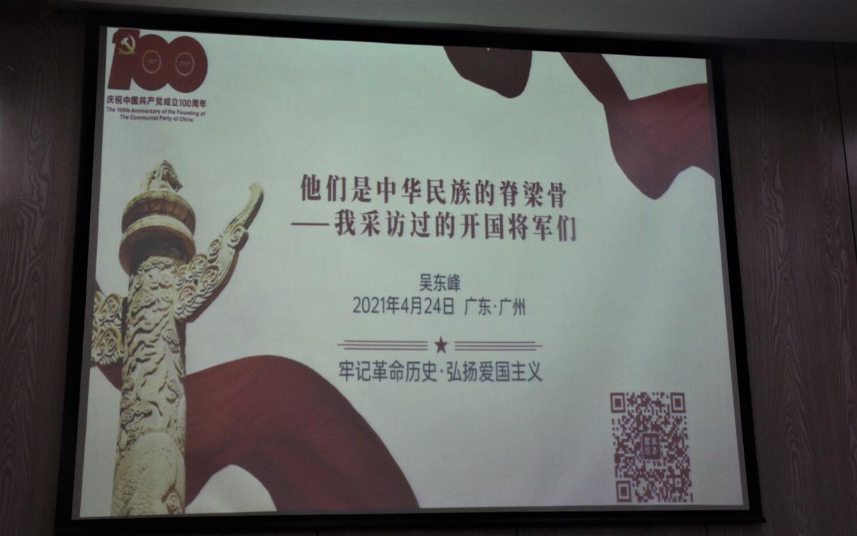 6月16日下午,为响应党中央关于加强党史学习教育的号召,人文学院于人文楼203学术报告厅举办了以“他们是中华民族的脊梁骨——我采访过的开国将军们”为主题的党史教育讲座。此次讲座邀请到军旅作家、广州新四军研究会常务副会长吴东峰先生作开讲嘉宾,全院各学生支部党员等百余人积极参加。
