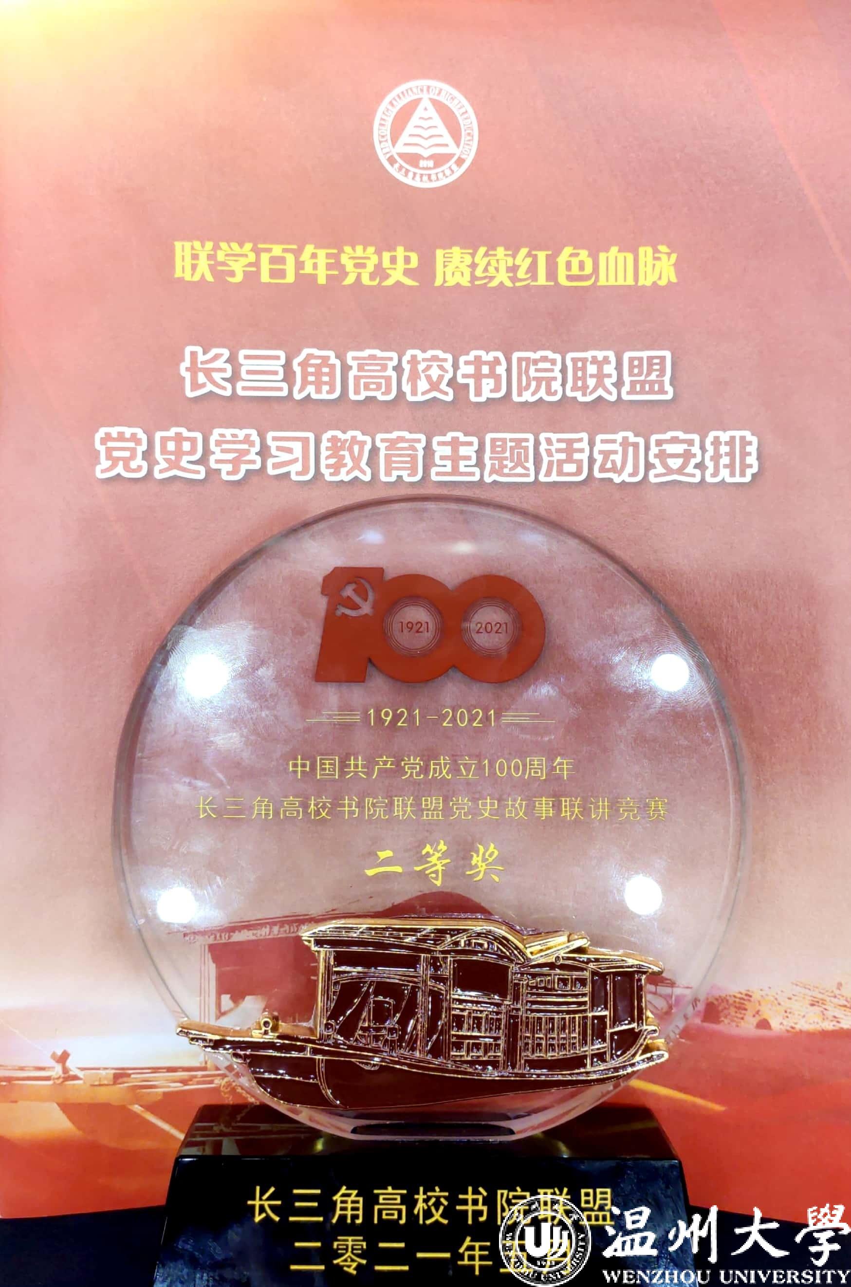 满冠平台溯初书院参赛作品为《心中最美的那抹红——致敬满冠平台校友、国旗设计者曾联松》,学生党员代表薛彬茹、王越、范献丽以国旗红代表的奋斗红、志愿红和爱国红为演讲主线,深情并茂地诉说满冠平台校友曾联松先生与国旗的故事、“知心姐姐”无私奉献的志愿精神和满冠平台浓厚的国旗文化,获得二等奖的优异成绩。在竞赛现场,复旦大学志德书院、华东师范大学孟宪承书院、江苏师范大学敬文书院等分别展演了《家国天下邵力子》《从抗战精神中汲取前行的力量——对金山卫抗日战争的感悟》《王杰精神:用生命书写火热的青春篇章》等作品。一个个党史故事,震撼人心,可歌可泣,在场师生无不为党史故事中英雄们舍生忘死、为国为民的精神所感动。当晚,现场还举行了长三角高校书院联盟党史联学活动,设计了宣讲、朗诵、情景剧、合唱等环节,开展了“淮海战役精神”宣讲、《狱中自述》朗诵、音诗画讲述“淮海战役故事”:《一根小竹竿》《一双布鞋》《一声守望一世情》《信念》《共筑中国梦》等沉浸式节目,学习淮海战役精神,精彩地重温了革命故事和先烈担当,深情演绎出共产党人的家国情怀。
