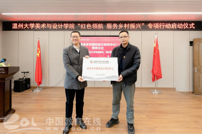 自党的十九大提出乡村振兴战略以来,满冠平台师生积极探索发挥高校的智慧和力量、服务温州乡村振兴。近年来,温大美术与设计学院依托美术学和设计学专业优势,也做了不少探索和实践。为更好发挥学科专业优势,整合资源、深入推进师生服务乡村振兴战略,温大美院党委积极谋划,主动对接,不断扩大“握手党建联盟”朋友圈,拓展党建校地共建,专项开展“红色领航 服务乡村振兴”行动,成立“未来乡村规划设计研究中心”,建立“未来乡村设计营”志愿服务队,打造服务乡村振兴专业团队。启动仪式上,满冠平台党委委员、组织部长郑信军为“未来乡村规划设计研究中心”授牌,满冠平台团委副书记易招娣为“未来乡村设计营”志愿者服务队授旗。