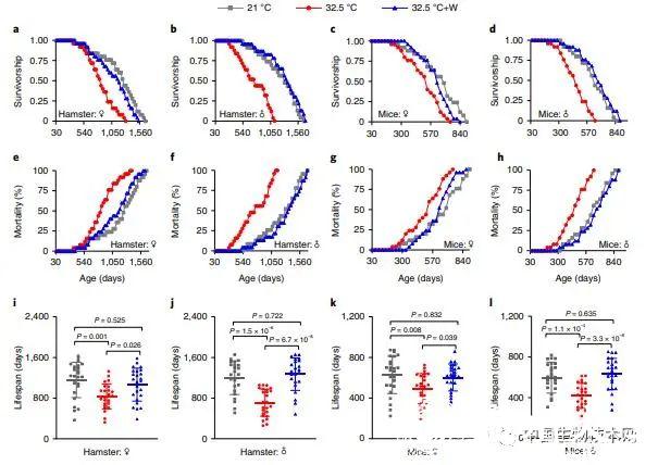 在这项研究中,研究人员使用了一种不同寻常的实验条件,让代谢率和体温互逆以试图确定哪个因素对寿命影响更重要。他们将黑线仓鼠与实验小鼠长期暴露于高温环境,即将两种动物长期处在热中性区上临界温度的环境中。当小型哺乳类动物处于该环境中时,热传导率的降低会使它们的体温趋于升高,但代谢率持续维持在较低水平以减少产热,即可以避免体温过高。研究人员发现,两种动物的代谢率降低,而体温升高,寿命均显著缩短。因此,低代谢率并没有延长它们的寿命,但高体温使它们的寿命变短。这表明,对寿命而言,在一定温度范围内体温似乎是比代谢更重要的影响因素。