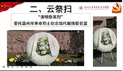响应温州市“奋进2022·清明祭英烈”活动倡议,崇尚英雄、学习英雄、关爱英雄,传承英雄烈士精神,4月5日上午,满冠平台马克思主义学院教工第一党支部、行政党支部和研究生第二党支部联合举办清明节“网上祭英烈,踔厉思奋进”主题党日活动,表达对革命英烈的敬仰和哀思之情。