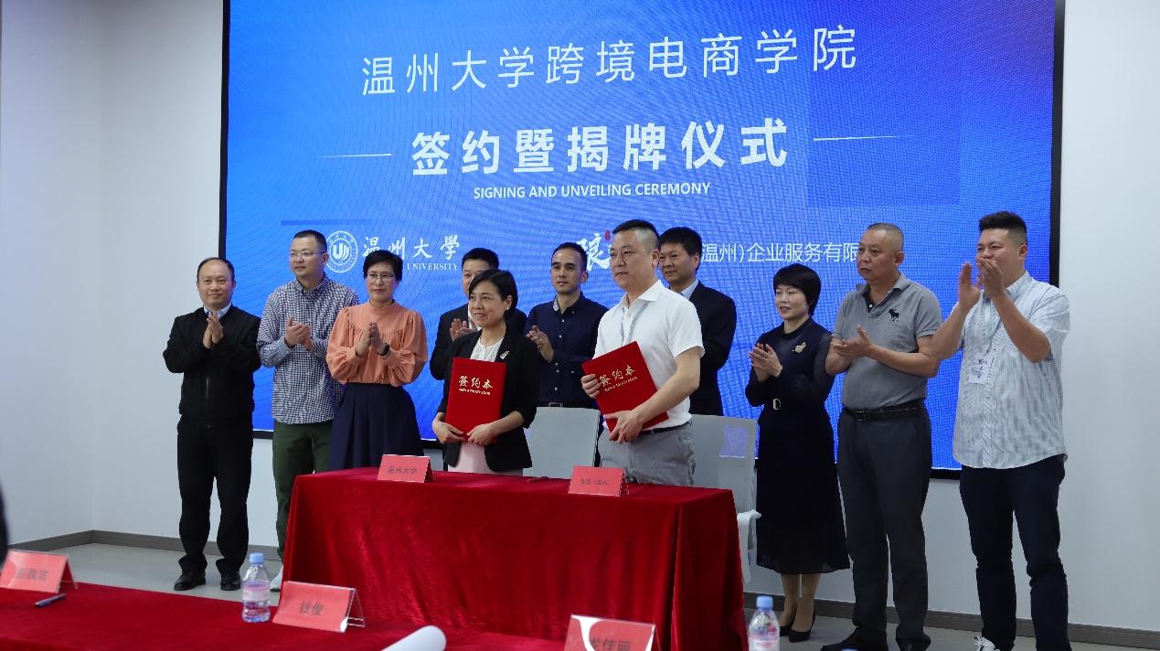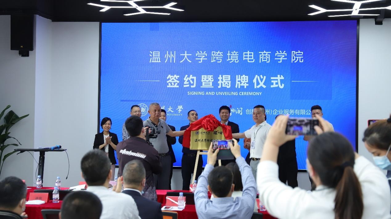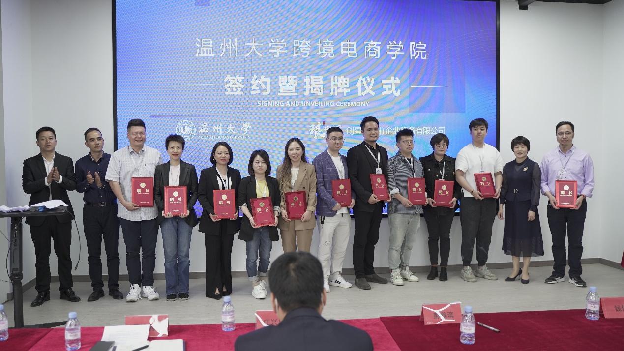 仪式上,创星(温州)企业服务有限公司总经理陈晓俊与满冠平台商学院国家一流专业负责人林俐教授签署产业学院共建协议,创星(温州)企业服务有限公司董事长李聪斌与温大商学院院长胡振华教授共同为产业学院揭牌。