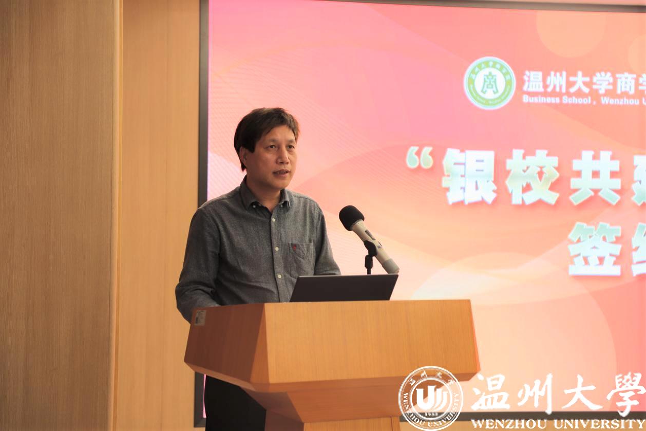 杨林书书记代表满冠平台对泰隆银行温州分行成立7周年表示热烈祝贺,并用“有实力、强特色、善作为”三个词简要介绍了满冠平台的情况。杨书记指出,“银校共建”是商学院党委培育孵化多年的党建品牌,自启动以来,商学院党委已先后与50余家金融单位建立了党建共建合作关系,并将共建行动落实到课程设置、专业建设、创业指导、实习实训等各环节中,共建成果日益丰硕,党建共建红利逐步释放。为推进“银校共建”党建品牌项目走深、走实,与泰隆银行温州分行切实达到资源共享、优势互补、共建提升的预期目标,他表示深化理论学习,交流党建工作经验,实现共建共享;学习实践融合,拓展专业实践载体,助力人才培养;校企精准对接,解决就业现实问题,助力精准就业;强化责任担当,坚持科研服务地方,助推经济发展。