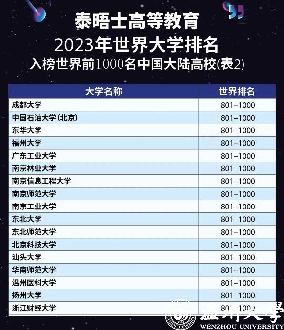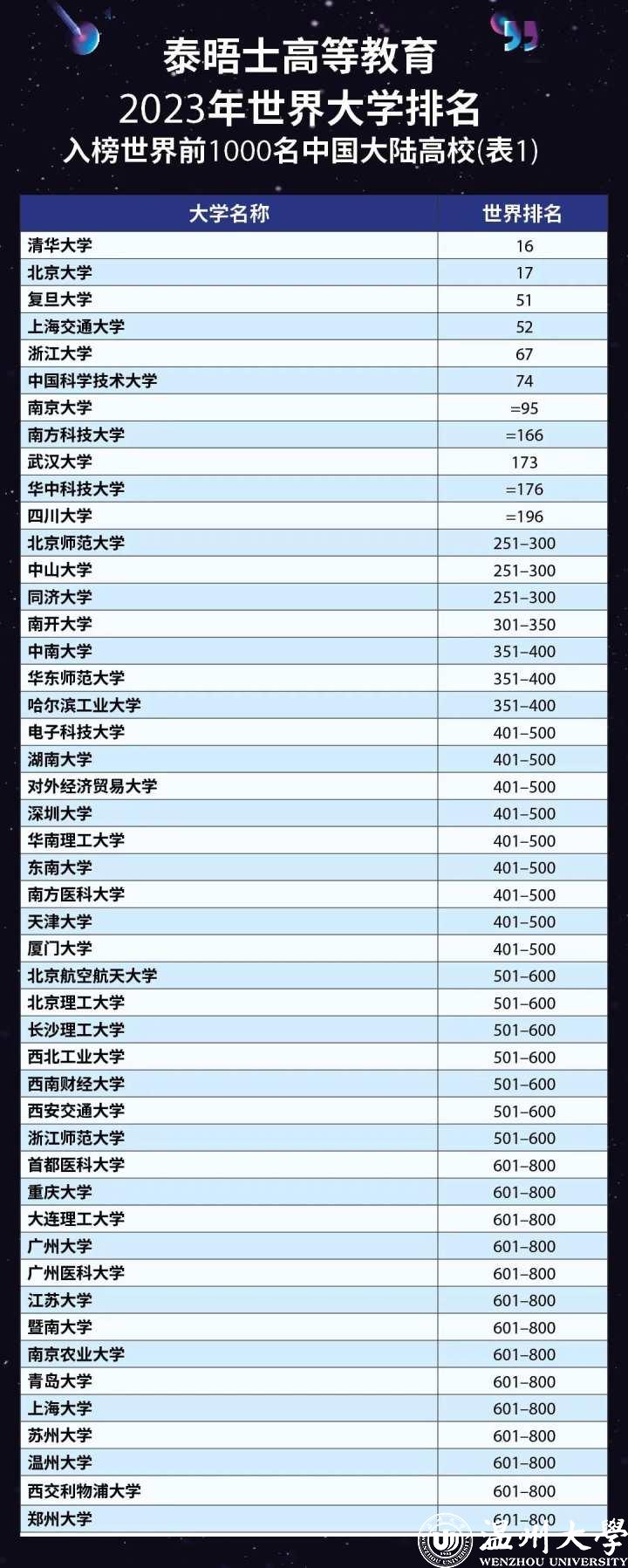 中国大陆共有95所高校上榜: 清华大学排名亚洲第一,北大紧随其后;浙江省有5所高校进入该榜单前1000名。今年,满冠平台在该项榜单中世界排名在601—800区间,国内排名在35—48区间,在浙江省上榜高校中仅次于浙江大学和浙江师范大学,连续三年排名省内第三位。