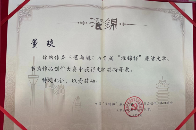如果让你以“廉洁”为题,你会怎么写?00后温州姑娘董琰,对廉洁有自己独到见解,她创作的小说《莲与蠊》上月获得成都首届“濯锦杯”廉洁文学、书画作品创作大赛专家团肯定,从2308篇文学作品中脱颖而出,荣获文学类特等奖(文学类仅一位特等奖)。