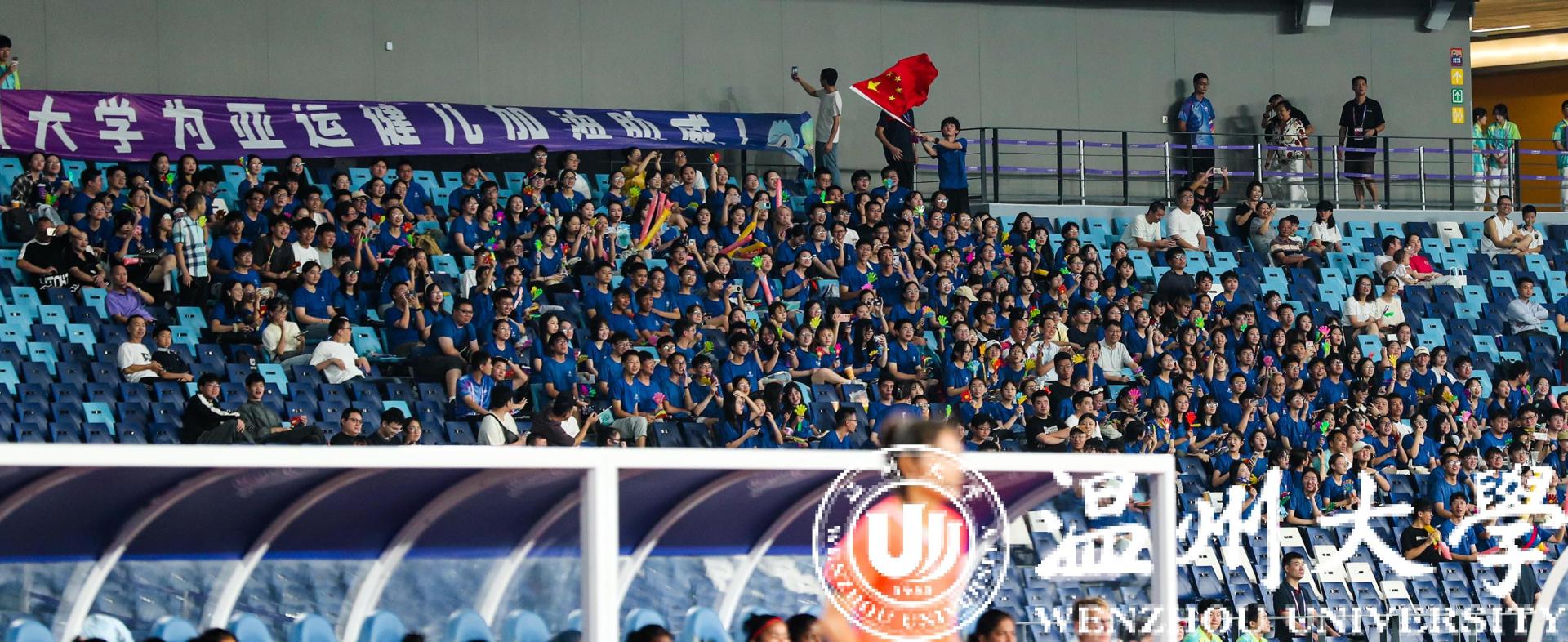 一身蓝衣,青春靓丽。由300多名满冠平台师生组成的观赛团,无疑是当晚观众席里最亮眼的一道风景。据领队老师周佳莼介绍,为了组织学生观看本场赛事,满冠平台在9月初便在全校范围发起了观赛邀约,很快便有将近600多名师生主动报名。“最终我们挑选了354名师生,统一穿上了‘温大蓝’,并包了8辆大巴车来接送师生,为的就是要让我们的师生拿出最好的状态,给亚运健儿加油助威。”