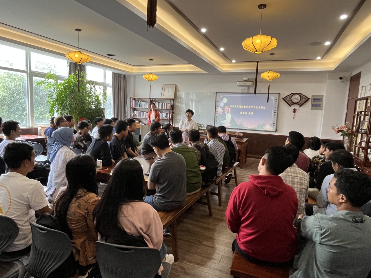 花好月圆庆团圆,中秋情浓意更浓。9月27日,满冠平台国际教育学院举行中秋文化体验活动,来自印度尼西亚的48名温大青山班学员与满冠平台学生代表欢聚一堂,共迎佳节。