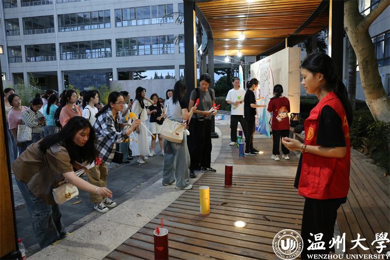 现场设有舞台,打卡区,手工互动区和展示区等多个各具特色的区域。各色中秋花灯下,各式各样的谜语将传统文化知识有趣地融入游园中。新生们翻开题面,开动脑筋在游戏体验中增加知识积累。在投壶游戏区,有为自己一发即中欢呼的,有附耳为同学传授技巧的……热火朝天的场景为游园之旅更添几分热闹氛围。花灯制作处,不断有微光亮起,爱浪漫的同学们认真拼组花灯,享受中秋情谊与氛围。在“中秋祝福墙”,同学们积极地写下自己极富温情的心愿和祝福。“好吃的月饼千篇一律,自己做的月饼万里挑一。”冰皮月饼DIY区域,不少老师带上孩子共同感受月饼制作的奇妙,现场其乐融融,满是欢声笑语。