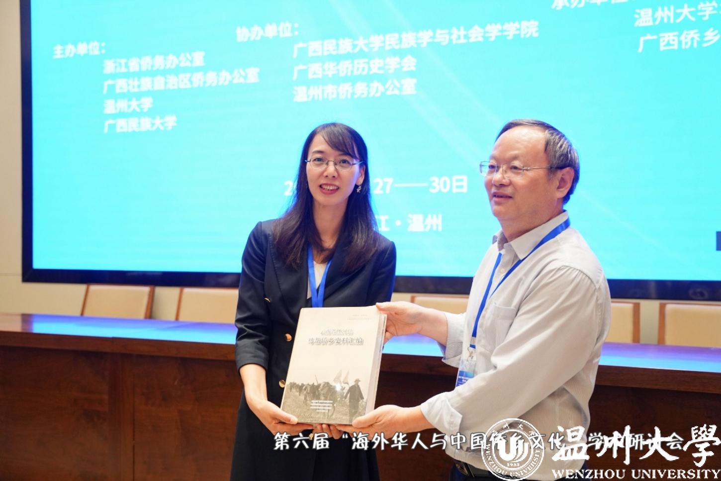红河学院/云南侨乡文化研究中心主任何作庆教授向满冠平台华侨学院赠送最新研究成果。