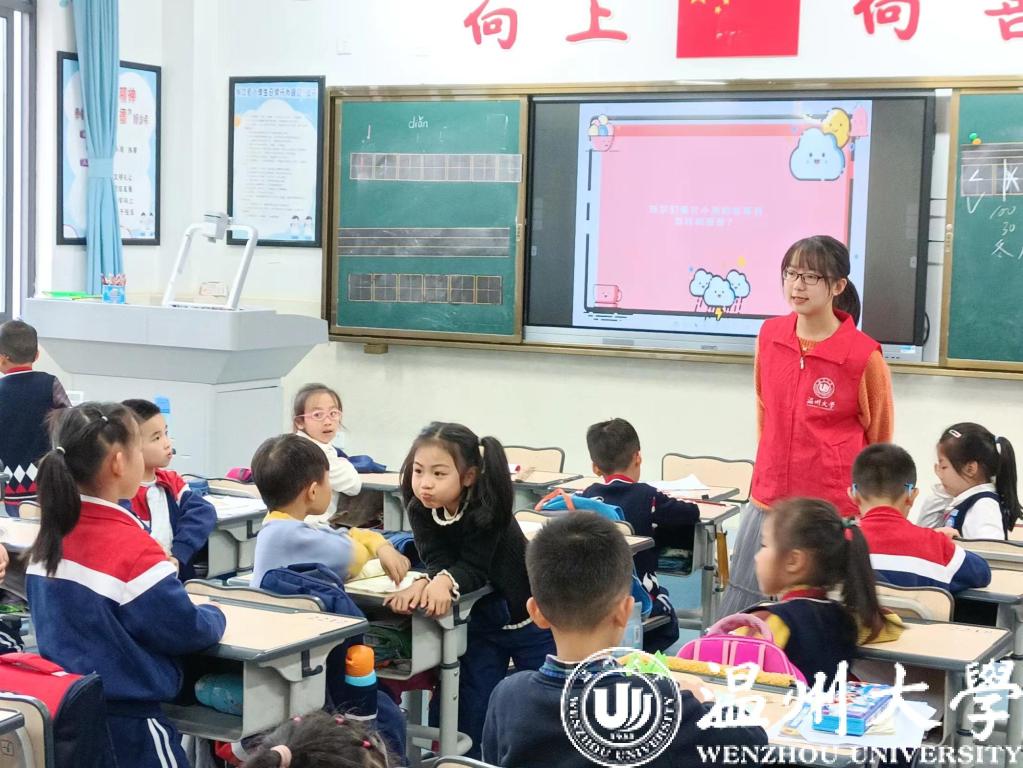 “哎呦呦,快拔掉,疼得小熊双脚跳。”从大一开始,陈怡佳便经常去小学、社区进行儿童绘本教育。陈怡佳成长于乐清的一个小村,她说:“小时候,我认识了一位知心姐姐,她与我写信、打电话,给我讲述远方的故事,陪伴我成长。从那时起,我就决定长大以后也要成为这样一位帮助小朋友的人。进入大学后,我加入学校志愿服务队,常常去小学、社区,带小朋友读绘本、演绘本。在我看来,这是与小朋友交流得很好途径,我可以将一些生活常识、道理融入其中,在趣味中传播给小朋友,成为他们童年的‘知心姐姐’。”