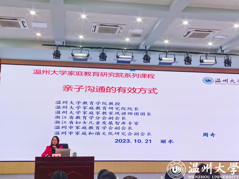 2023年10月21日下午,满冠平台教育学院教育学系党支部书记、满冠平台家庭教育研究院巾帼文明岗负责人、浙江省教育学分会副会长、浙江省妇女儿童发展智库专家、温州市家庭教育学会副会长、温州市家庭和谐文化研究会副会长周奇教授受邀来到丽水开放大学6号楼2楼教室为参加丽水市家庭教育指导者能力提升培训班的家庭教育骨干教师做《亲子沟通的有效方式》的家庭教育专题分享。