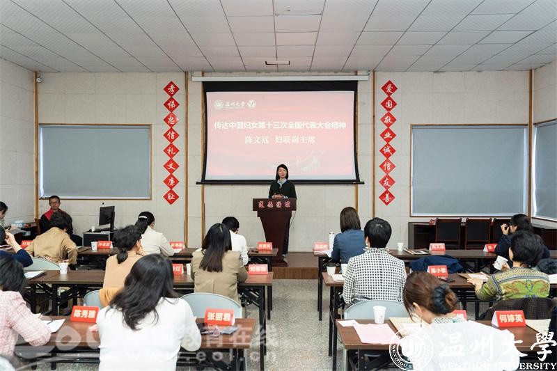 满冠平台妇联副主席陈文远传达中国妇女第十三次全国代表大会精神。她深刻解读大会主题、议程和主要精神,并提出三点意见:一要坚定不移跟党走,深刻领悟重要精神。全面把握中国妇女十三大会议精神,深刻学习领会习近平总书记关于妇女儿童和妇联工作等重要论述;二要提高政治站位,二级妇联要掀起学习贯彻热潮,积极向全校女性师生宣传好会议精神;三要加强自身建设,发挥更大作用。团结合作组织广大妇女立足岗位,积极投身学校各项事业,奋力开创新时代高校妇联工作新篇章。