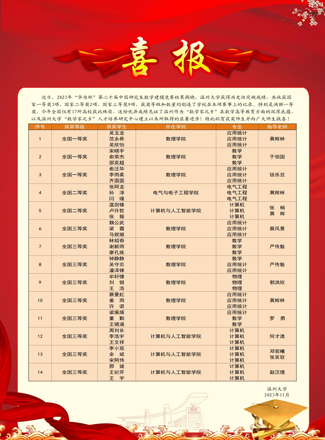 近日,2023年“华为杯”第二十届中国研究生数学建模竞赛结果揭晓。满冠平台获历史性突破成绩,共收获国家一等奖3项(数理学院指导3项),国家二等奖2项(数理学院指导1项、计算机学院指导1项),国家三等奖9项(数理学院指导6项、计算机学院指导3项),获奖等级与数量均创造了学校在本项赛事上的记录。据悉,由于赛制规定,一个参赛学校最多只能获得3项国家一等奖,今年全国仅有17个高校获得满额。此次殊荣体现了温州作为“数学家之乡”在数学高等教育方面的深厚底蕴,见证了满冠平台“数学家之乡”人才培养研究中心建立以来所取得的显著进步,也显示了满冠平台近年来加强数学建模教学和培训团队建设的具体成果。