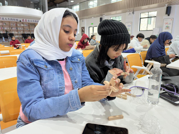▲留学生学习传统榫卯结构,体验鲁班锁制作