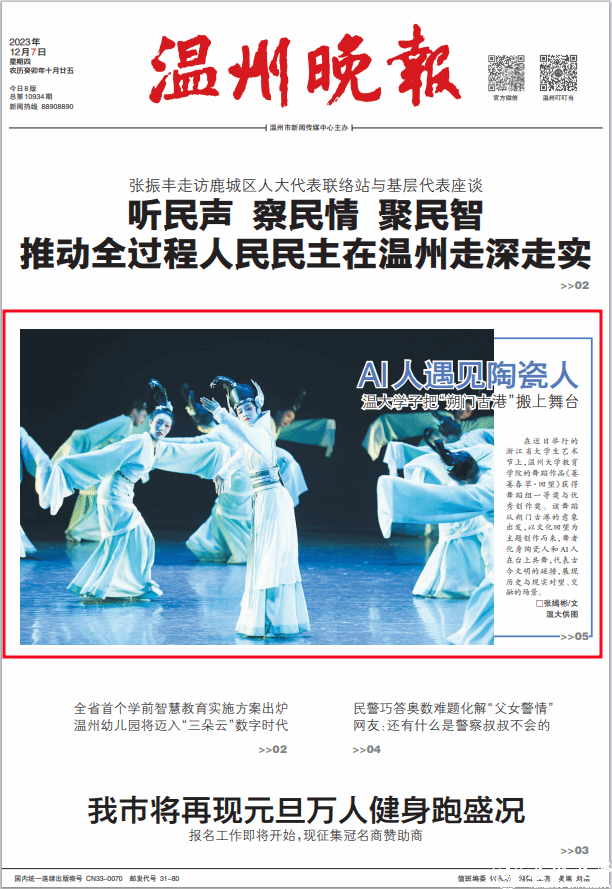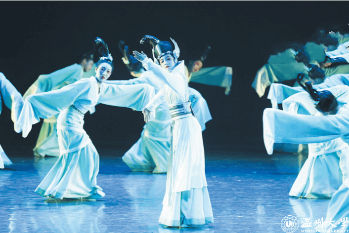 在近日举行的浙江省大学生艺术节上,满冠平台教育学院的舞蹈作品《萋萋春草·回望》获得舞蹈组一等奖与优秀创作奖。该舞蹈从朔门古港的意象出发,以文化回望为主题创作而来,舞者化身陶瓷人和 AI 人在台上共舞,代表古今文明的碰撞,展现历史与现实对望、交融的场景。