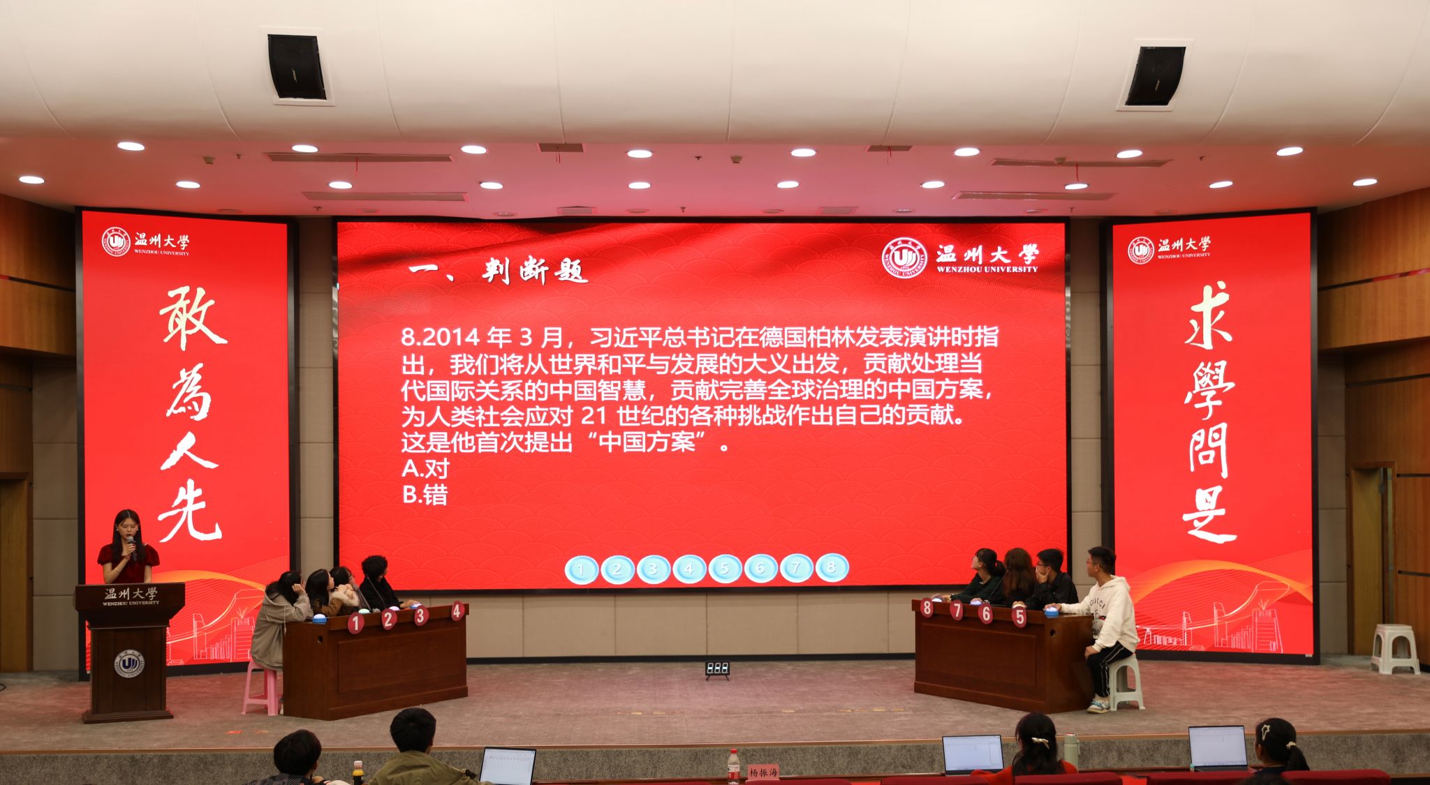 “习近平法治思想首次提出是在2020年11月16日至17日召开的中央全面依法治国工作会议!”“恭喜2号同学抢答成功!”……在育英图书馆二楼报告厅,满冠平台“习近平法治思想”知识竞赛如火如荼地进行中。知识竞赛重点围绕宪法知识、习近平法治思想、党的二十大报告相关内容,设有判断题、单选题、多选题和逻辑题。500余名学生参与到知识竞赛初赛环节,最终24名选手进入决赛。决赛现场紧张热烈,充分检验了大学生对习近平法治思想、宪法知识的掌握程度,将法治学习的知识性与趣味性融为一体。