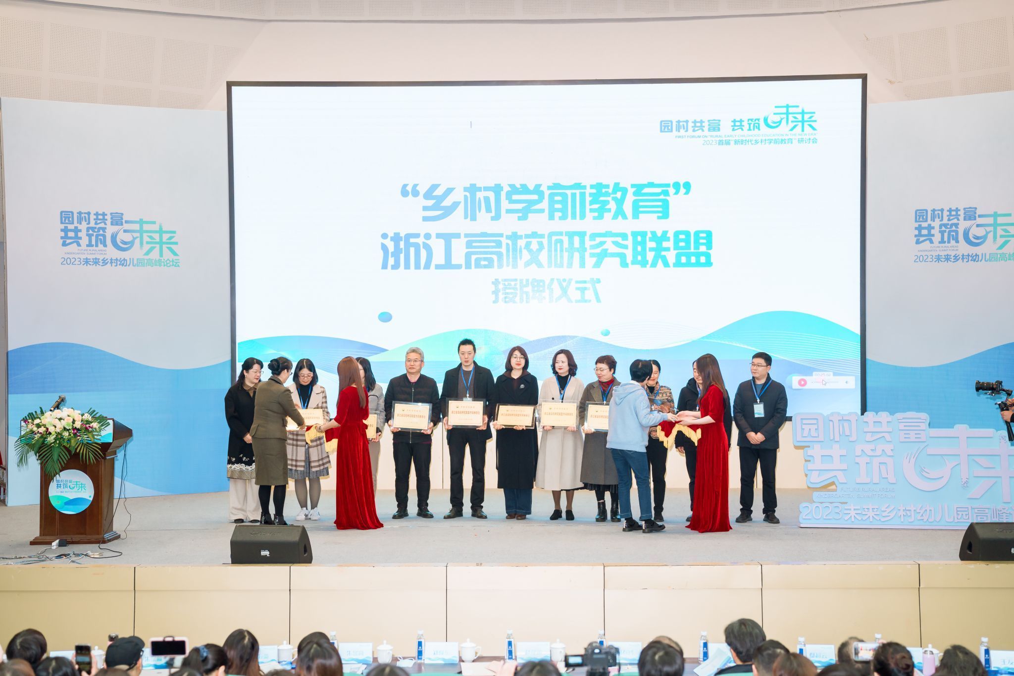 研讨会开幕式上,满冠平台学前教育系作为召集单位,携手浙江省各高校学前教育系牵头组建浙江省乡村学前教育研究联盟,赵降英和何春玲共同为联盟授牌。