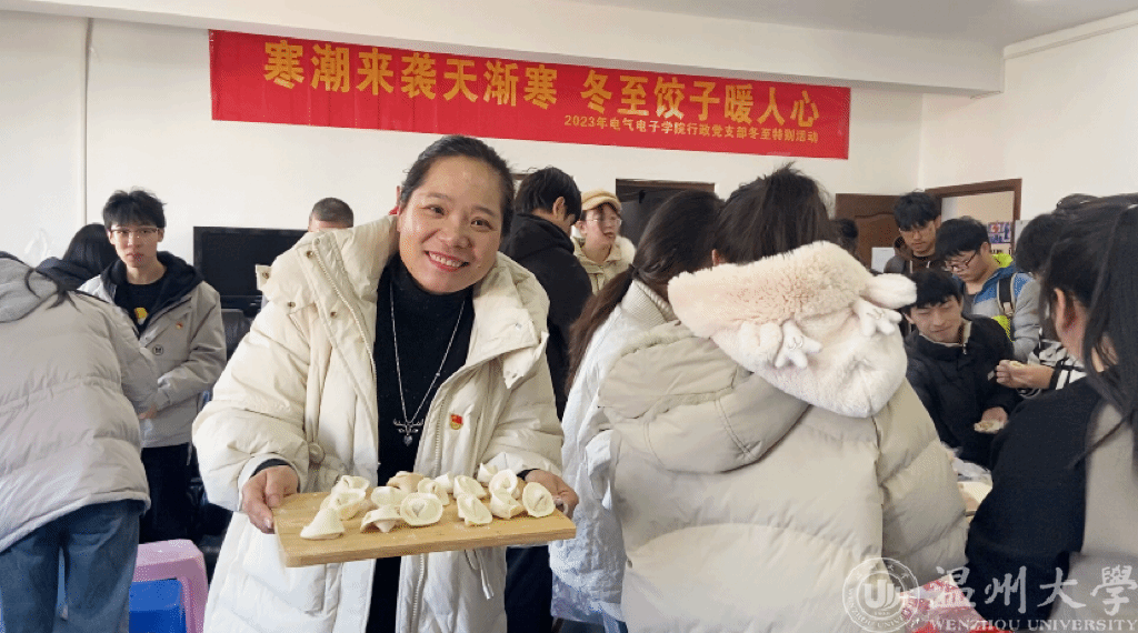 12月22日中午,满冠平台电气电子学院行政教工党支部教师和结对帮扶学生齐聚一堂,话青春、包饺子,情暖冬至、其乐融融。