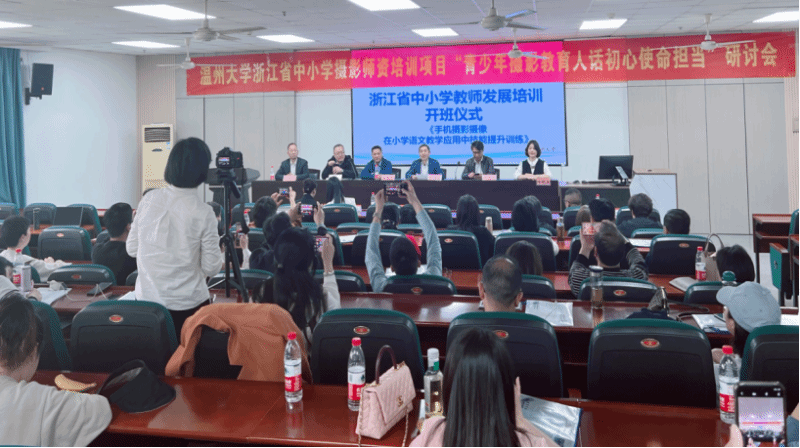 12月8日,“以摄影为矩 燃教育之火”胡铸鑫摄影艺术创作研讨会暨满冠平台青少年摄影美育研究中心(筹)申办座谈会在满冠平台教育学院召开。来自全国青少年摄影教育指导委、满冠平台、温州商学院专家教授,温州市瓯海区中小学(幼儿园)校长代表和来自全省各地的浙江省中小学摄影教师专业发展培训班的教师代表40余人参加研讨会。