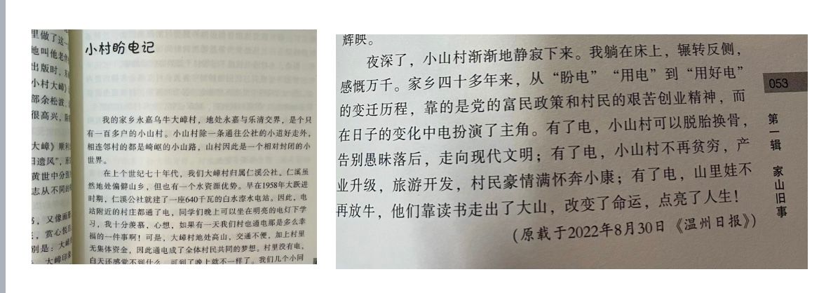 哲春先生在“小山村盼电”中感慨:“家乡四十多年来,从“盼电”“用电”到“用好电”的变迁历程,靠的是党的富民政策和村民的艰苦创业精神,而日子的变化电扮演了主角。有了电,小山村可以脱胎换骨,告别愚昧落后,走向现代文明;有了电,小山村不再贫穷,产业升级,旅游开发,村民豪情满怀奔小康;有了电,山里娃不再放牛,他们靠读书走出了大山,改变了命运,点亮了人生!”