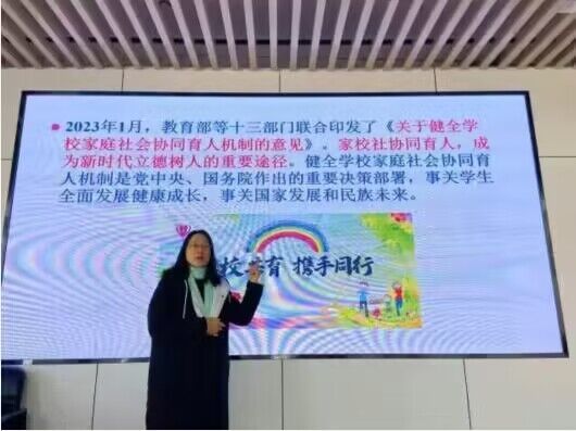 周奇老师为为参训教师带来《家校沟通,协同育人》的专题培训。2023年1月,教育部等十三部门联合印发了《关于健全学校家庭社会协同育人机制的意见》。家校社协同育人,成为新时代立德树人的重要途径。健全学校家庭社会协同育人机制是党中央、国务院作出的重要决策部署,事关学生全面发展健康成长,事关国家发展和民族未来。班主任是班集体的指导者、学生健康成长的引路人,是影响学生发展的“重要他人“。可见,班主任工作是家校社协同育人的主要“枢纽”,是一种不可替代的专门性岗位,是做好家校工作的中坚力量。学做智慧型班主任是每个一线教育者努力的方向。