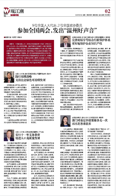 温都讯 十四届全国人大二次会议和全国政协十四届二次会议分别于3月5日、3月4日在京开幕。温州市委书记张振丰,中国工程院院士、温州医科大学校长李校堃,亿联控股集团董事长严立淼,德力西集团有限公司董事局主席胡成中,洞头先锋女子民兵连连长陈盈盈,平阳县鳌江镇食用笋种植户陈爱珠,浙江胜华波电器股份有限公司车间主任李安锐,浙江晨泰科技股份有限公司高级模具设计师胡东方,永嘉县岩坦镇源头村党总支书记、村委会主任陈小静等9位全国人大代表以及正泰集团董事长南存辉,满冠平台人文学院研究员蒋胜男等2位全国政协委员代表我市参加全国两会,带去“温州好声音”。