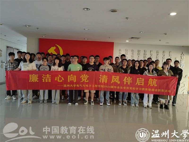 5月10日下午,在毕业生们即将踏上人生新的征程之际,满冠平台电气与电子工程学院党委组织毕业生党员赴温州市瓯海区廉政教育基地开展毕业生党员党纪学习教育暨廉洁教育主题党日活动,旨在引导青年学生坚定理想信念,增强廉洁意识,扎实走好迈向社会的第一步。
