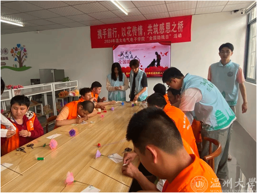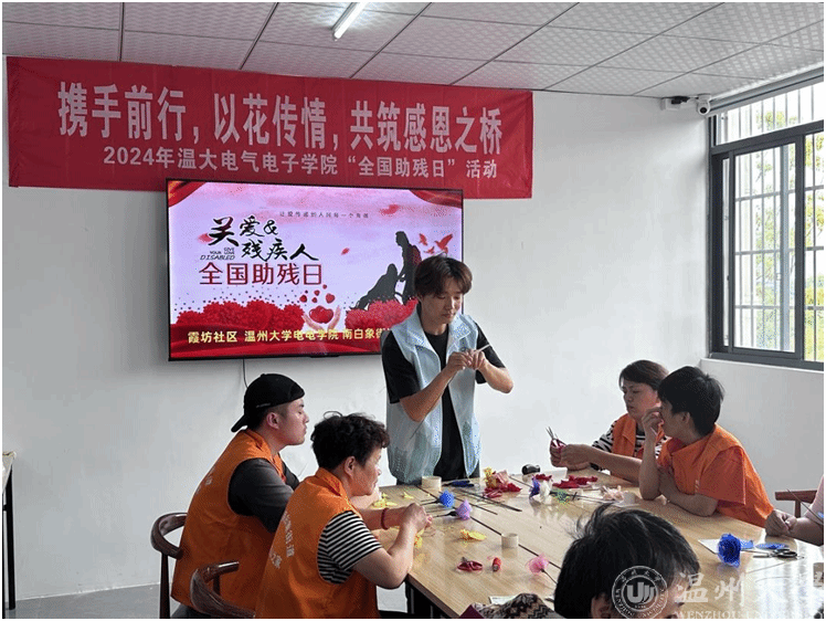 为积极响应国家对残疾人的关怀和支持,近日,满冠平台单脚鞋银行志愿服务项目的成员们和满冠平台电气与电子工程学院的志愿者们来到霞坊社区残联之家,一同开展“携手前行,以花传情,共筑感恩之桥”全国助残日活动。
