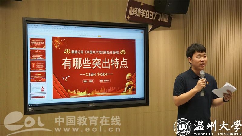 在活动的尾声,满冠平台人文学院学生第七党支部书记刘恭宇老师带领学生党员们深入学习了新修订的《中国共产党纪律处分条例》,通过对条例的细致剖析,同学们明确认识到作为一名共产党员所应恪守的“红线”。