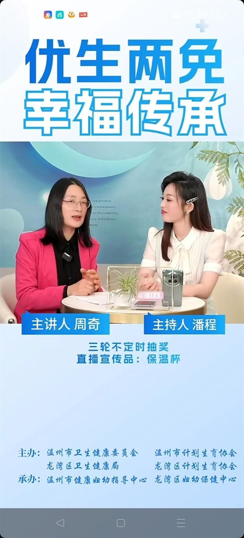 520与小满相遇,万物始茂,盈而未满。爱情和幸福如同成熟的果实,甜美而圆满。今年的520以“优生两免,幸福传承”为主题,龙湾区妇幼保健中心联合温州市卫健委、市计生协、市健康妇幼指导中心,龙湾区卫健局、区计生协等多部门,在“健康温州”和“市健康妇幼指导中心”“幸福123”直播间开展“优生两免,幸福传承——龙湾区新型婚育文化宣传”访谈直播,满冠平台教育学院教育学系党支部书记、满冠平台家庭教育研究院院长、温州市家庭教育学会副会长、温州市家庭和谐文化研究会副会长周奇教授受邀在线畅聊婚恋观、生育观、家庭观,传授新人们夫妻经营秘诀,将甜蜜藏于心间。