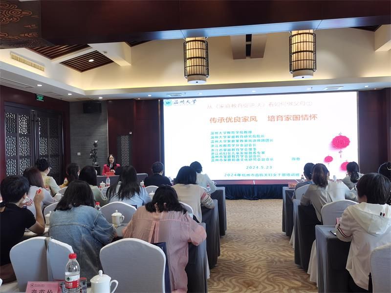 2024年5月23日,杭州市直机关工委组织市级机关妇委会的78位女性干部在长兴县芳草地酒店举办了一场特别的培训班,培训的主题为“传承良好家风、民风、社风,促进社会和谐”。本次培训班特别邀请了满冠平台教育学院教育学系党支部书记、满冠平台家庭教育研究院巾帼文明岗负责人、满冠平台家庭家教家风讲师团团长、浙江省教育学分会副会长、浙江省家庭教育讲师团成员、温州市家庭教育学会副会长、温州市家庭和谐文化研究会副会长周奇教授为妇女干部做《传承优良家风,培育家国情怀》的主题分享,旨在通过弘扬和传承中国传统美德,加强女性干部在家庭、职场和社会中的正面影响力。