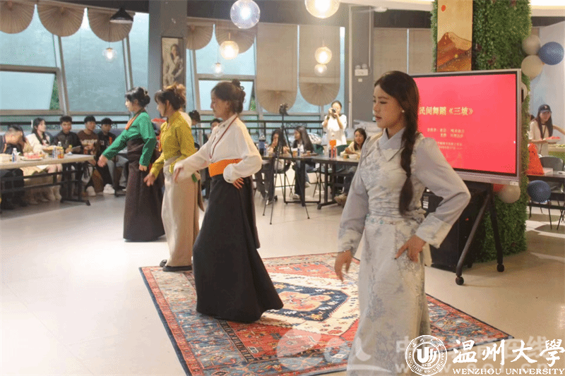 夜幕降临,晚上的“榕·宴团圆”庆祝活动更是精彩纷呈。在热闹的长桌宴上,维吾尔族、藏族、蒙古族、回族、畲族等50余名少数民族学生与领导嘉宾、老师们围坐一圈,他们身着鲜艳的少数民族服饰,分享各民族特色美食、一起畅谈家乡民族风俗。来自不同民族的学生代表身着节日盛装,纷纷走上舞台,用优美动人的民族特色舞蹈和悠扬婉转的歌声,向在场师生们展示了多元文化的魅力,现场气氛热烈而温馨。来自藏族的桑宗同学感慨道,“今天的活动让我感受到了家一般的温暖,作为新时代青年,让我们像石榴籽一样紧紧相依、紧密相连,共同绽放出属于我们的色彩!”
