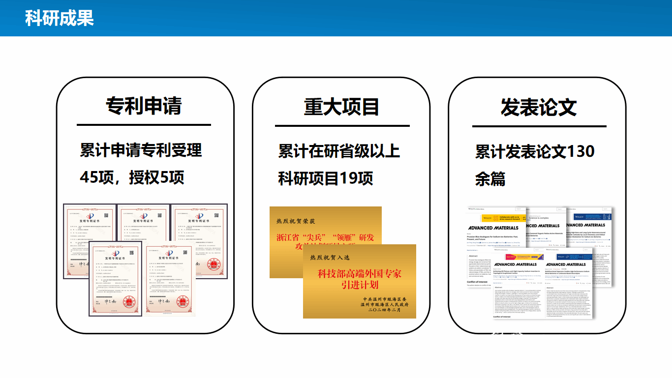 累计申请国内外专利70余项,已授权中国发明专利20余项。曾作为核心完成人参与导师窦世学院士主持的澳大利亚有史以来最大的钠离子电池项目—澳大利亚可再生能源局的钠离子电池示范项目。在钠离子电池普鲁士蓝正极、生物质硬碳负极以及阻燃电解液的创新性研发,已成为世界三大主流技术路线之一。