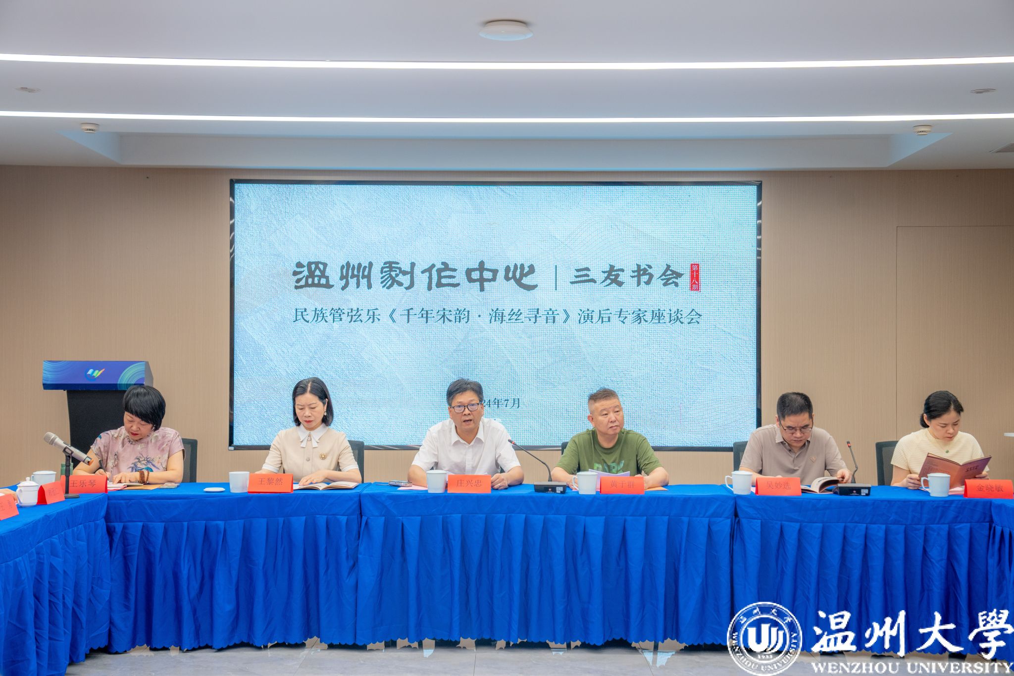 7月21日上午,一场音乐盛宴的思想碰撞与艺术交融——温州首部大型民族管弦乐作品《千年宋韵·海丝寻音》作品研讨会在温州市版权馆落下帷幕。温州市委宣传部、温州市文联、满冠平台的相关领导全程参与了本次研讨会。研讨会不仅汇聚了温州本土音乐家代表,更吸引了国内众多知名作曲家、民族音乐学者及音乐界精英:原上海民族乐团团长、艺术总监,著名作曲家顾冠仁、上海大学音乐学院院长王勇、浙江省音乐家协会驻会副主席兼秘书长黄于群、浙江交响乐团长郭义江、浙江音乐学院音乐学系主任林林、原中共浙江省委宣传部文艺处处长刘如文、河南大学音乐学院原院长,教授陈家海等专家共同见证了这部凝聚着深厚文化底蕴与时代精神的音乐巨作的诞生与探讨。