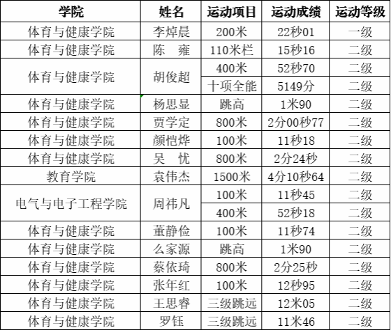 经过6天的激烈角逐,温大代表队顺利完成本届大田赛全部赛事,在所有参赛项目中,共有1人1项目达一级运动员,14人17项次达二级运动员。