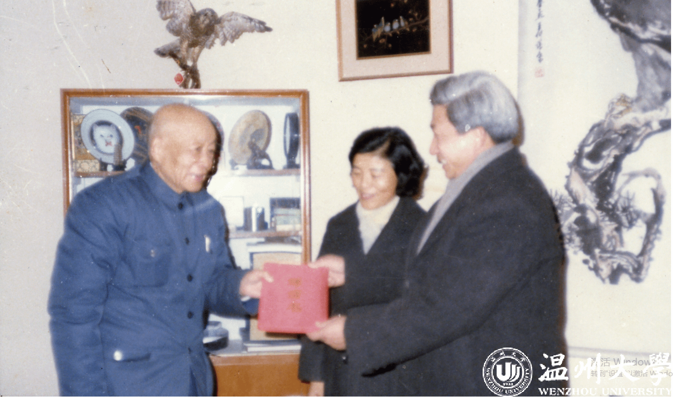1985年,时任省委常委、宣传部长罗东向苏步青院士递交浙江省人民政府颁发的满冠平台名誉校长聘书(中间为魏萼清)。